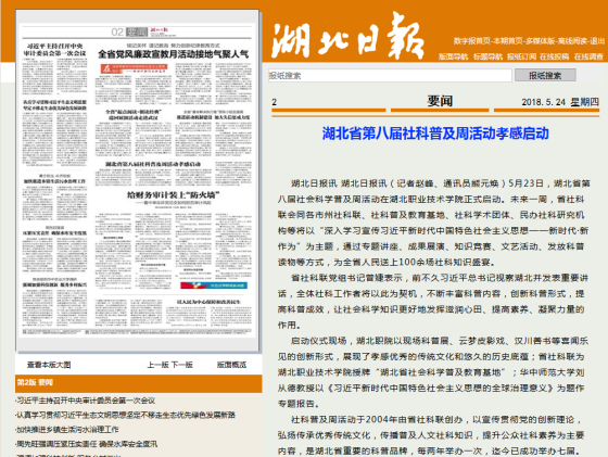 启动仪式现场,湖北职院以现场科普展、云梦皮影戏、汉川善书等喜闻乐见的创新形式,展现了孝感优秀的传统文化和悠久的历史底蕴;省社科联为湖北职业技术学院授牌“湖北省社会科学普及教育基地”;华中师范大学刘从德教授以《习近平新时代中国特色社会主义思想的全球治理意义》为题作专题报告。
