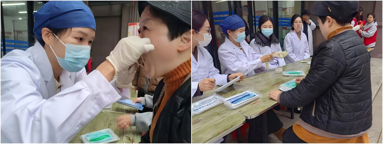 专业义诊岗上:口腔医学院的师生们为社区居民开展免费口腔检查,细致查看牙齿健康状况,耐心讲解龋齿预防、牙周护理等知识,并结合居民个体情况给出科学诊疗建议,用专业守护群众口腔健康。